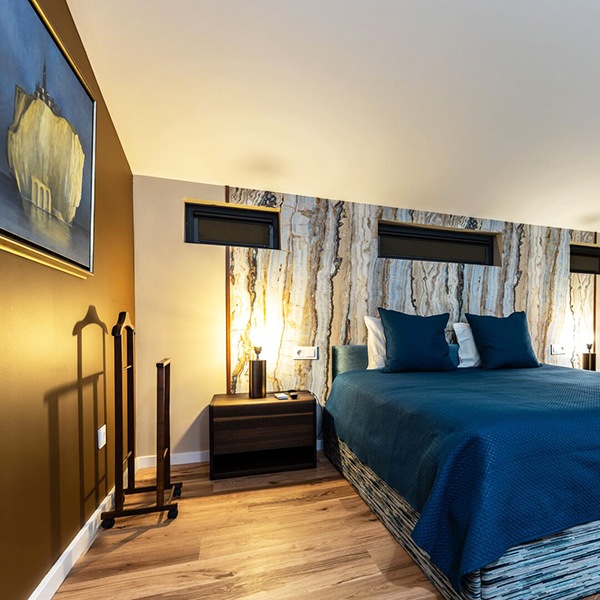 Le texture organiche della parete le conferiscono un carattere unico, quasi tattile, evocando la serenità della natura e un senso di rifugio. Uno spazio che ispira calma, comfort e brevi pause piene di fascino.